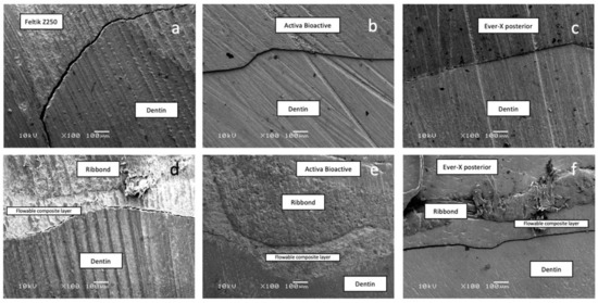 - Belli, S.; Donmez, N.; Eskitascioglu, G. The effect of c-factor and flowable resin or fiber use at the interface on microtensile bond strength to dentin. J. Adhes. Dent. 2006, 8, 247–253. [Google Scholar]
