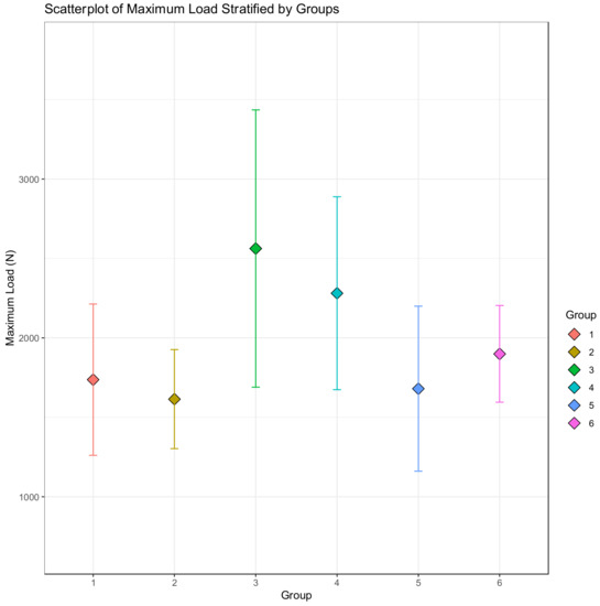 Scatterplot depicting the distributions of data for the maximum load measured in Newtons. Diamonds indicate the means and error bars represent one standard deviation. Visual inspection suggests non-normally distributed data.