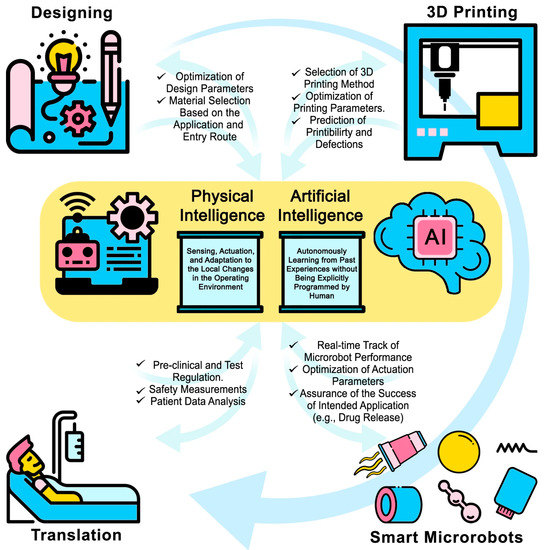 - Dabbagh, S.R.; Sarabi, M.R.; Birtek, M.T.; Seyfi, S.; Sitti, M.; Tasoglu, S. 3D-Printed Microrobots from Design to Translation. Nat. Commun. 2022, 13, 5875. [Google Scholar] [CrossRef]