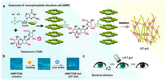 - Cheng, X.; Chen, H.; Yang, F.; Hong, J.; Cheng, Y.; Hu, J. All-Small-Molecule Supramolecular Hydrogels Assembled from Guanosine 5′-Monophosphate Disodium Salt and Tobramycin for the Treatment of Bacterial Keratitis. Bioact. Mater. 2022, 16, 293–300. [Google Scholar] [CrossRef]