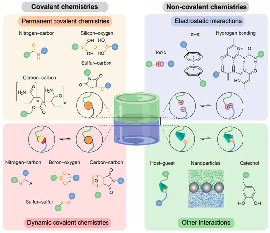 - Bovone, G.; Dudaryeva, O.Y.; Marco-Dufort, B.; Tibbitt, M.W. Engineering Hydrogel Adhesion for Biomedical Applications via Chemical Design of the Junction. ACS Biomater. Sci. Eng. 2021, 7, 4048–4076. [Google Scholar] [CrossRef] [PubMed]