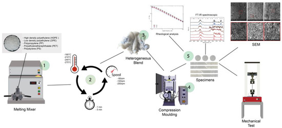 The HDPE/LDPE/PP/PET/PS mixtures were prepared according to the composition given in Table 2 by melt mixing in a Brabender mixer (Brabender, model PLE 330, Duisburg, Germany)
