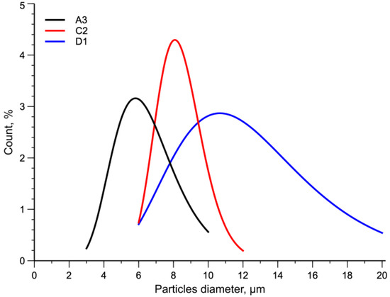 In Figure 4 the particle diameter distribution for the three samples is reported. Statistical functions were used to describe the distribution of particles. In particular, the normal distribution was used. The curves shown in the figure confirm the qualitative observations made on the micrographs.
