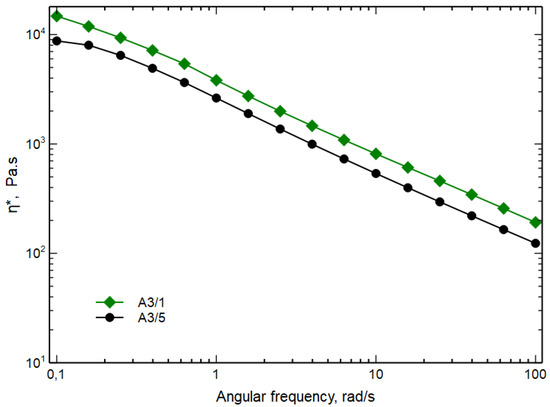 Complex viscosity as function of angular frequency of A3/1 and A3/5 blends.