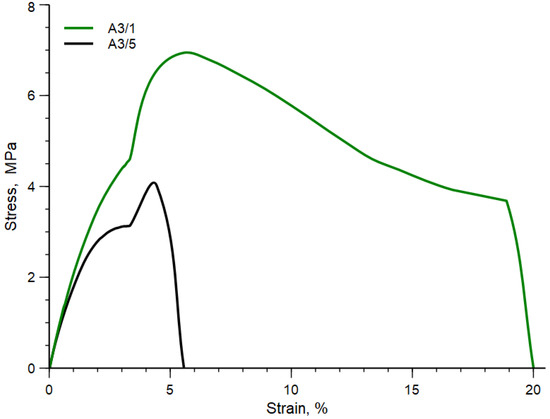 The two stress-strain curves are strongly different. Indeed, the curve relative to the A3/5 sample is the typical stress-strain curve of a fragile polymer, while the stress-strain curve of sample A3/1 shows yield stress and ductile behavior.