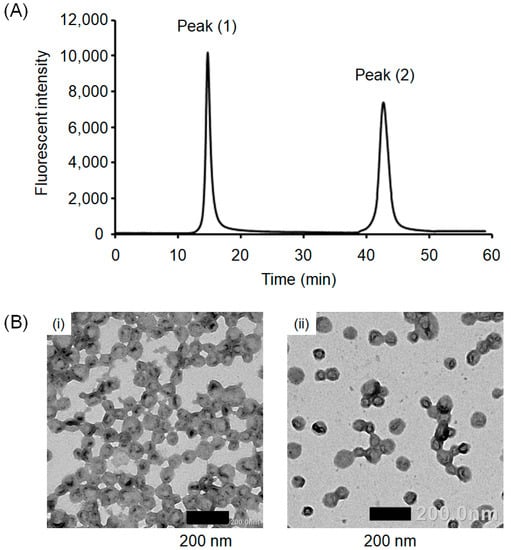 Dynamic light scattering (DLS) measurements were performed on a Zetasizer-nano (Malvern Instruments Ltd., Worcestershire, UK) to determine the particle size distribution. Transmission electron microscopy (TEM) was performed using a JEM-1400 microscope (JEOL Ltd., Tokyo, Japan) operating at 120 kV. The samples for TEM were dispersed in purified water and transferred onto 400 mesh size copper grids coated with a thin film of collodion and carbon, followed by staining with uranyl acetate. Fluorescence intensity was measured using a NanoDrop 3300 spectrophotometer (Thermo Fisher Scientific, Waltham, MA, USA).