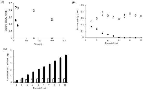 Stability of CD@PICsome. (A) Time-dependent enzyme activity change of free CD and CD@PICsome in 10 mM PBS (pH 7.4) at 40 °C (□: CD@PICsome, ■: free CD). The x-axis represents the starting time of enzyme activity measurement from the enzyme-containing sample preparation. (B) Enzyme activity change of free CD and CD@PICsome for repetitive use at 40 °C (□: CD@Cy5-PICsome, ■: Free CD). (C) Amount of 5-FU produced with the repetitive use of CD (■: CD@Cy5-PICsome, □: Free CD).