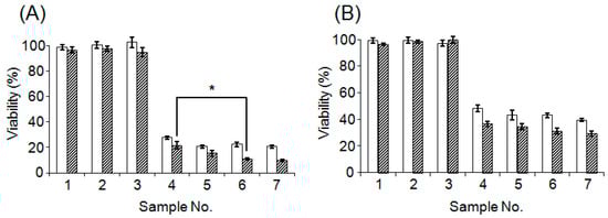 Cell viability after treatment with 5-FC, 5-FU, and CD@PICsome: (A) C26 cells, and (B) A549 cells (open bar: 48 h after addition of samples, slashed bar: 72 h after addition of samples). Notably, 5 µL of 0.2 U/mL CD@PICsome was added, followed by the addition of 5 µL of 0.04 or 0.08 mg/mL of 5-FC. As reference experiments, cells were treated with 5-FC (samples 2 and 3), CD@PICsome (sample 1), or 5-FU (samples 6 and 7) at the same concentration as samples 4 or 5; 10 mM PBS (pH 7.4) was used as a negative control (sample 8). All samples were incubated in multi-well plates at 37 °C in a humidified atmosphere containing 5% CO2. After a 48 h or 72 h incubation, viability was measured. * p < 0.05 (between samples 4 and 6 at 72 h). The values in parentheses represent concentrations of CD, 5-FC, or 5-FU in each well.