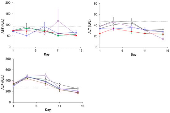 Hepatotoxicity of EPT based on CD@PICsome and 80 mg/kg of 5-FC (◊, black, group 2), 10 mg/kg of 5-FU (■, green, group 3), 80 mg/kg of 5-FU (□, purple, group 4), CD@PICsome (×, black, group 5), 5-FC (○, red, group 7) and 10 mM PBS (pH 6.8) (∆, blue, group 8). The gray dotted line represents the average value for normal female BALB/c mice.