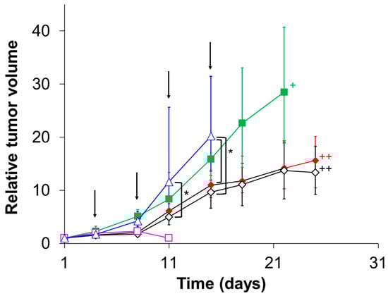 The tumor growth change in C26-bearing mice (n = 5) treated with CD@PICsome and 10 mg/kg of 5-FC (♦, red, group 1), CD@PICsome and 80 mg/kg of 5-FC (◊, black, group 2), 10 mg/kg of 5-FU (■, green, group 3), 80 mg/kg of 5-FU (□, purple, group 4) and 10 mM PBS (pH 6.8) (∆, blue, group 8),. An arrow indicates administration day of 5-FU or 5-FC or 10 mM PBS (pH 6.8). *: p < 0.05. ++: n = 3, +: n = 4.