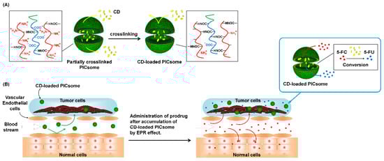 As previously demonstrated, cytosine deaminase (CD)-loaded PICsomes prepared via the SWCL method successfully converted the non-toxic prodrug 5-fluorocytosine (5-FC) to its active form, 5-fluorouracil (5-FU) []. Notably, 5-FU is a widely used anticancer drug. However, there are strong side effects, mainly due to its non-specific distribution in healthy tissues [,,,]. Alternatively, the 5-FC CD-convertible prodrug has a longer plasma half-life, lower toxicity in humans, and low cellular uptake in human cells []. These attributes make 5-FC a good candidate for prodrug. Moreover, the molecular weight of CD (~18 kDa) is considered to be suitable for the SWCL method according to the previous report [], and CD could permeate the PIC membrane after the first crosslinking but not after the second crosslinking. Herein, we designed and developed CD-loaded PICsomes for the CD/5-FC DEPT system (Scheme 1). Finally, the superior therapeutic effect and reduction of side effects were confirmed in the treatment of the tumor-bearing mice model compared to the effects of systemic administration of 5-FU alone.