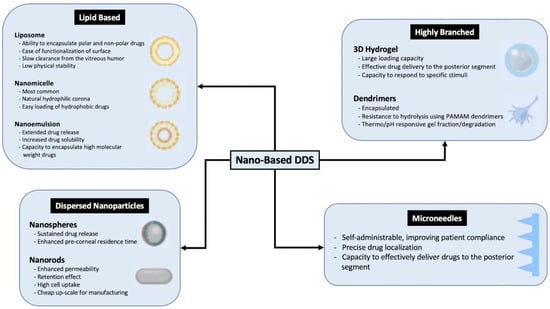 Nano-based DDS have been designed to improve sustained and targeted drug delivery to various targets within the eye. The characteristics of these systems are outlined in Figure 2.