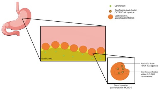 In the development of such a system, the use of a multi-component platform incorporating microparticles in a macroparticle has the potential to exhibit the ideal characteristics for gastric retention, such as gastro-flotation (flotation in gastric media due to its lower density) and gastro-adherence, in addition to the ideal properties of density, size and shape, as described above [13]. This study therefore provides for the development of a microparticle-in-macroparticle, gastrofloatable and gastroretentive platform for the delivery of NAW drugs (MGDDS). Ciprofloxacin, a broad-spectrum antibiotic with a NAW, has been used as the model-drug for the development of this system [14]. Ciprofloxacin is a weak base and has increased solubility and stability in the acidic environment of the stomach; a common property of NAW drugs [15]. The prepared system functions by retaining the ciprofloxacin-loaded units in the gastric media, slowly releasing the model drug into the gastric contents, thereby allowing for enhanced absorption in the proximal intestine. The MGDDS was developed using chitosan (CHT) and Eudragit® RL 30D (EUD), for their gelling and controlled-release properties, prepared into microparticles, which were thereafter incorporated into an ionic crosslinked gastrosphere for the controlled release of ciprofloxacin over 12 h. The gastrospheres were prepared from alginate (ALG), pectin (PEC), poly(acrylic acid) (PAA) and poly(lactic-co-glycolic) acid (PLGA). ALG and PEC were chosen for their gelling and gastrofloatable properties and their crosslinking potential with calcium ions, with PAA and PLGA utilized for their controlled release, gastroretentive and biodegradation properties [16,17,18,19]. The in vitro characterization of the developed platform was undertaken using FTIR and SEM prior to in vivo evaluation in a Large White Pig model. Additionally, molecular modeling of the drug-polymer interaction was undertaken. A schematic diagram summarizing the gastroretentive and drug release properties of the MGDDS is provided in Figure 1. In this figure, the microparticles containing ciprofloxacin incorporated into the gastrofloatable gastrospheres, as well as the subsequent release of ciprofloxacin into the gastric media is depicted.