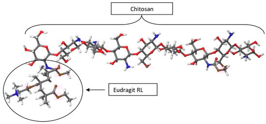 The CHT-EUD polymer virtual synthesis using molecular modelling technology was initiated on a 3D workspace known as a 3D Builder. The CHT and EUD were crosslinked by the 3D Builder tool to form a co-polymer that was further polymerized under the Polymer Builder panel. The Nanoparticle Builder subsequently generated a nanosphere from the final polymer showing the positively charged Eudragit RL head and the CHT tail (Figure 2) in agreement with the literature [32,33].