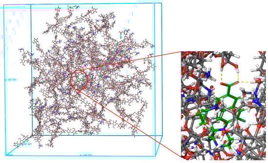 To further identify the polymer interaction site as well as the polymer configuration in the composite, the two monomers involved in the drug interaction were selected for analysis (Figure 4). This revealed that CHT-EUD interacted with the ciprofloxacin at the crosslink of the co-polymer mainly with the terminal glucosamine moiety of the CHT. Interestingly, this interaction pulled the crosslinking portion inward which then provided for the outward facing of the EUD, exposing the positively charged amine groups to the surface. This is the best configuration since the positively charged EUD is known to promote the cellular uptake of the drug through the ionic interactions with the negatively charged cellular membranes [34,35]. Moreover, the rest of the ciprofloxacin structure interacted with the polymers through the weak van der Waals forces. The balanced hydrogen bonding with the weaker van der Waals forces provide for the controlled release properties of the drugs [35], suggesting that the ciprofloxacin release will be sufficiently controlled.