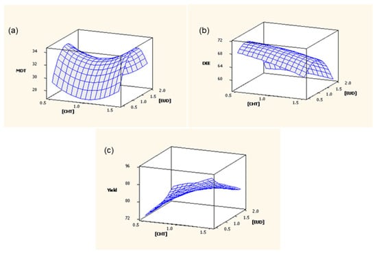 The MPY for the design formulations was relatively high (77 to 92%), with only one formulation (Formulation 13) deviating from this range at 65% (Table 2). The influence of CHT and EUD on MPY is depicted in Figure 5c, where at low CHT concentrations MPY was low, with a higher MPY at increased CHT concentrations. Additionally, an increase in the EUD composition resulted in a decrease in MPY. The decreased MPY can be explained by the increase in viscosity of the polymer solution because of the increased CHT concentration, with a viscous solution more resistant to fragmentation into small droplets.