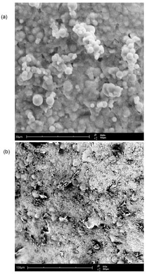 SEM images of (a) the optimized microparticle system (magnification: 2640×) and (b) MGDDS (magnification: 615×). Image reproduced with permission from reference [36], © University of the Witwatersrand, South Africa.