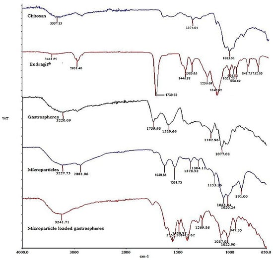 The evaluation of the FTIR spectra of the microparticle, the gastrosphere and its component polymers (as provided in Figure 7) revealed that the NH stretching vibrations (at wavenumbers 3300–3500 cm−1) were found in the native CHT and EUD compounds, which were still noted in the prepared microparticles [37]. Additionally, C=O vibrations were seen in the native EUD spectra (between wavenumbers 1700 and 1900 cm−1) and again in the evaluation of the microparticle formulation; however, with a decreased intensity [38]. The other C-H bands (at wavenumbers 2800–2950 cm−1; 1355–1395 cm−1; 1405–1465 cm−1 and 1430–1470 cm−1) were noted to be present in all the spectra. The C=O ester (at the 1730 cm−1 peak) seen in the native EUD spectra, was, however, significantly diminished in the microparticle spectra with a new peak formed at 1531 cm−1. This result is consistent with the previous research on polymer systems consisting of CHT and EUD [39,40]. The noted diminishing of the esterified carboxyl group bands can also be attributed to the amount of CHT present, with the CHT concentration in the microparticle system being greater than the EUD [40]. It was also noted that the strong bands at ±3200 cm−1 observed for both the microparticle and gastrosphere systems, were still present after the formulation of the MGDDS. The results of this analysis therefore confirmed that the chemical nature of the native polymers was maintained during the production process and that there was no chemical interaction due to the incorporation of the microparticles into the gastrosphere system. This result is of importance as changes to the chemical structure can affect the functionality and safety of the polymer system.