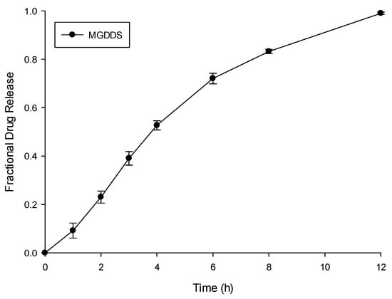 The ciprofloxacin release profile of MGDDS in SHGF (pH 1.2, 37 °C; n = 3; SD ≤ 0.031 in all cases).