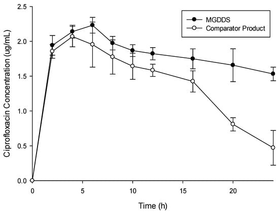 Pharmacokinetic modelling was achieved using PKSolver to undertake a non-compartmental and compartmental analysis of the in vivo plasma ciprofloxacin levels and thus determine the AUC and plasma half-life of ciprofloxacin from the MGDDS and commercial comparator product [31].