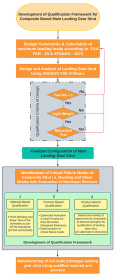 Patunkar et al. [] presented a comparison of a suspension system composed of glass fiber and steel leaf spring after carrying out their complete design and analysis using Pro-E® and ANSYS 10.0®. The results presented in their research work showed that the deflection of the steel leaf spring was better than the composite leaf spring but at the cost of weight. A significant weight reduction of 84.4% was achieved by using a composite leaf spring suspension system. Xue et al. [] also used a flexible leaf spring and presented a flexible multi-body dynamics model for the aircraft suspension system. Similarly, carbon-fiber-based landing gear struts were also presented by Liang et al. [] with complete computational design and analysis and experimental validation. A comprehensive selection methodology for fiber-reinforced composite materials for retractable main landing gear struts of a lightweight aircraft up to 1600 kg mass is proposed by the authors in one of their recent studies []. In our previous work, four different fiber-reinforced composite materials were used for the design of the main landing gear struts of the aircraft under one-point landing condition. Finally, a material having a maximum strength-to-weight ratio and qualifying Tsai-Wu failure criterion was recommended for manufacturing the struts. Once the landing gear strut is manufactured based on the qualified design and using the selected material, a full-scale prototype is qualified for further installation on an aircraft subject to the clearance of a drop test as per the standard defined in the UAV Systems Airworthiness Requirements (USAR) [] and Air Worthiness Standards FAA FAR Part 23 []. In compliance with the drop test, either a complete aircraft or a landing gear unit is used for the drop test to validate the strength of the landing gear system. For this purpose, the limits for drop test heights are between 9.2 inches and 18.7 inches as per the standards mentioned above. However, no qualification framework is available during mass production for conventional as well as composite-based landing gear struts. In the same context, the research aimed to propose the qualification criteria which would not only be required to be fulfilled before undertaking the full-scale manufacturing task of main landing gear struts but would also be used as the qualification criteria of the main landing gear struts of the given aircraft during mass production. As no studies are available in the literature that are relevant to qualification criteria of composite main landing gear struts during mass production, the methodologies proposed in this research are therefore considered to be novel, and are shown in Figure 1. This aim is achieved through developing a qualification criterion for the mass production by using available ASTM testing standards for the evaluation of mechanical properties of specimens. As bending and shear stresses are the most critical and prominent stresses encountered by the landing gear struts, bending and shear strength of the composite material can therefore be evaluated as per ASTM standards D 7264 [] and D 2344 [], respectively. Subsequently, the evaluation of these strengths can then be compared with the respective stresses and a logical framework can be developed for a qualification.