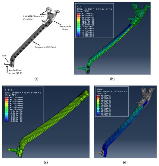 SOLIDWORKS® was used to develop CAD models of different dimensions of the main landing gear strut for the given aircraft within the given geometric constraints to ensure smooth retraction of the landing gear assembly inside the fuselage and to maintain the required ground clearance as well. After considering different combinations of dimensions and following the computational analysis for evaluating the designed landing gear struts against the Tsai-Wu failure criterion and strength-to-weight ratio, a design with constant width along the length was finalized. For computational analysis, the main landing gear strut was defined as a continuum shell and lay-up was performed in ABAQUS CAE® composite lay-up module. The sub-assemblies were modeled as metal, and a 30CrMnSiA alloy material was assigned. The hybrid joint between the sub-assemblies and composite main landing gear strut was modeled with tie constraint interaction. Eight-node quadrilateral elements of type SC8R were used for modeling composite landing gear strut. However, the metallic sub assemblies were modeled with mesh element type C3D10. A total of 82,820 elements were utilized for computational analysis of the assembly. Figure 2a depicts the initial CAD model of the main landing gear assembly and applied boundary conditions that were analyzed using ABAQUS CAE®. The main landing gear assembly as depicted in Figure 2a is composed of a retractable mounting bracket, a composite strut, and an axle for tire assembly. The landing gear strut is fixed within the retractable mounting bracket and has ENCASTRE boundary condition. A vertical load of 41,865 N was applied to the landing gear strut from the axle to a simulate one-point landing condition. Figure 2a–d depicts the complete design of the main landing gear assembly, results of maximum bending and shear stresses, along with the Tsai-Wu failure criterion value of 0.61 encountered by the landing gear strut under given loads.