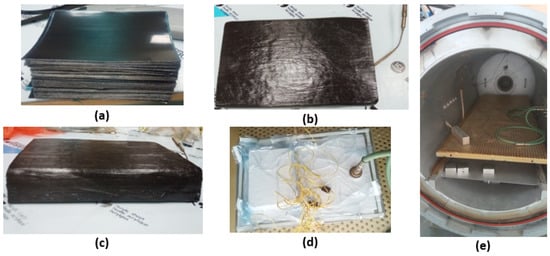 Defining of autoclave curing process for thick laminate: (a) Cutting of the pre-preg sheets on Zund cutter plotter. (b) Installation of the thermocouple at the mid-plane. (c) Final ply layup of required thickness. (d,e) Placement of uncured prepared laminate in the autoclave.