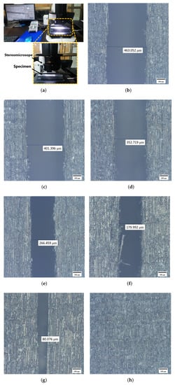 Stereo micrographs depicting the void reduction in the laminates under high pressure. (a) Setup for stereo microscopy. (b) A void of 463.052 m was observed at 1 bar pressure. (c) A void of 401.396 m was observed at 2 bar pressure. (d) A void of 352.719 m was observed at 3 bar pressure. (e) A void of 266.459 m was observed at 4 bar pressure. (f) A void of 179.992 m was observed at 5 bar pressure. (g) A void of 80.076 m was observed at 6 bar pressure. (h) No significant voids were observed at 7 bar pressure.