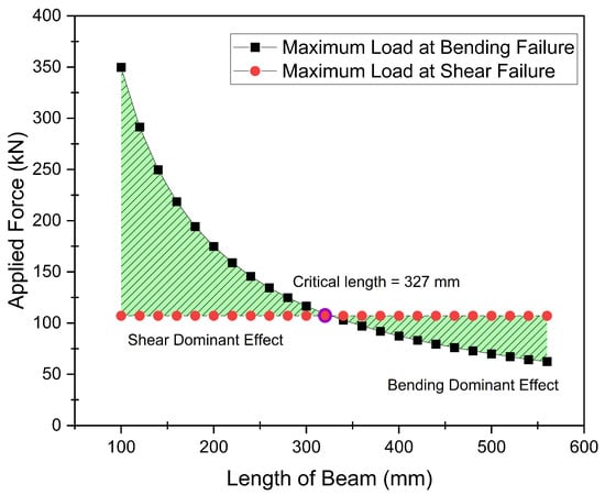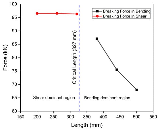 It is pertinent to mention that shear force does not change with varying length of the specimen. However, the value of bending force is greatly affected by the length of the specimen as shown in Table 6. As the bending and shear strengths of the material were already calculated as 1211.42 MPa and 70.5 MPa, respectively, in Section 3.1 above, it was important to evaluate the bending and shear forces required against these strengths for different dimensions of the specimens. For this purpose, the thickness of the specimen was fixed as 38 mm based on the computational analysis carried out for the complete landing gear strut. Similarly, a constant width of 30 mm was used for all the specimens as both stresses are inversely proportional to the width of the specimen. Varying lengths of the specimens were taken, starting from 100 mm to 560 mm against the experimentally calculated bending and shear strengths of the material to evaluate the corresponding bending and shear forces. It is pertinent to note that these values of analytically calculated forces were required for comparison with the experimentally calculated forces to validate the actual bending and shear strengths of the material for thick laminates. Moreover, a graph was plotted as shown in Figure 6 to determine the critical length of the specimen beyond which the bending force dominated the shear force and the specimen would break under the bending stress before the shear stress. As a result, a specimen length of 327 mm was specified, beyond which failure would occur in bending mode.