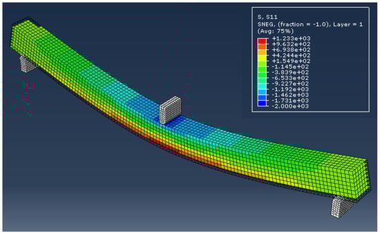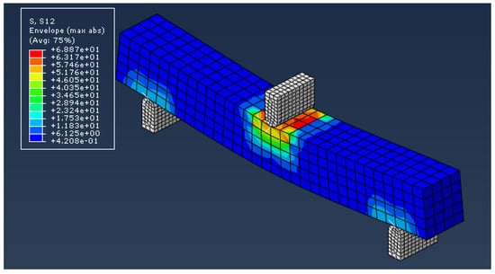 One of the experimental results of the T700 carbon fiber/epoxy material specimen was also compared with the computational analysis performed for bending and shear strength of the material using Abaqus CAE®. In this analysis, failure under bending and shear modes were closely examined and failure loads were compared with the experimental values obtained through destructive testing of the specimens. Figure 9 and Figure 10 show the results of these computational analyses. A comparison of these computational and experimental analyses depicts a variation of only 6–8%, which proves proximity in both approaches. Moreover, the computational model using Abaqus CAE® adopted for the evaluation of maximum bending and shear loads under one-point landing condition for the main landing gear strut were also validated based on this comparison.