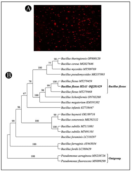 In order to amplify the 16S rRNA gene of isolate HSA3, genomic DNA was isolated and used for PCR amplification. As a result of 16S rRNA gene amplification and sequencing, isolate HSA3 was found to share a high identity with B. flexus. The sequence of the gene that was obtained from isolate HSA3 has been deposited to GenBank and obtained the accession number OQ281429. Phylogenetic trees were constructed for the isolate and other Bacillus species (Figure 1B).
