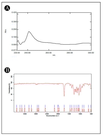The ultraviolet–visible (UV–Vis) spectroscopy and Fourier-transform infrared (FTIR) spectroscopy analysis were carried out to characterize the extracted PHB. The initial step was to analyze the extracted PHB using a UV–Vis spectrophotometer (Shimadzu, Kyoto, Japan), in which extracted PHB was dissolved in chloroform and analyzed in the range of 200–320 nm. The FTIR spectra were obtained between 500 to 4000 cm−1 (Bruker®, Billerica, MA, USA) [].