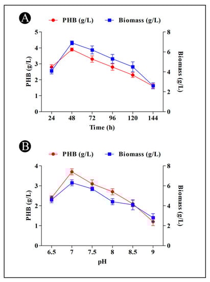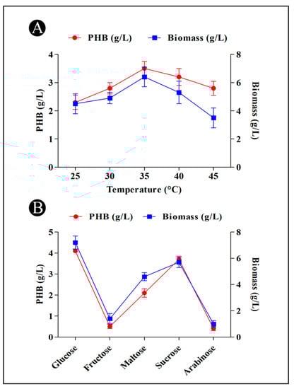 As part of the optimization of the PHB production process, a number of factors were examined, using temperatures (25–45 °C), pH values (6.5–9.0), incubation periods (24–144 h), carbon sources (arabinose, maltose, sucrose, fructose, and glucose), nitrogen sources (urea, glycine, yeast extract, peptone, and yeast extract + peptone). The fermentations were conducted in 50 mL of MSM under shaking at respective conditions. Calculation of PHB production was carried out as described above. To determine the biomass, cell pellets were collected after centrifugation and dried at 60 °C and expressed as g/L [].