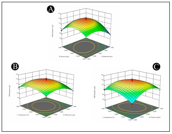 where Y is the predicted response (PHB production), and A, B, and C are the coded values of the test variables: wheat bran (g/L), peptone (g/L), and temperature (°C), respectively.