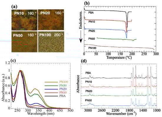 The synthesized copolymers exhibit nematic LC characteristics, which are confirmed by the POM observation (Figure 2a). Because the H-bonded dimer of BA is responsible for the LC characteristics of a polymethacrylate with BA side groups (PBA) [19,39,40,41,42], PBA has a large transition enthalpy (29.3 J/g) and a LC–isotropic transition temperature (Ti) of 179 °C. H-bond formation induces LC characteristics in several types of composite materials [43,44,45]. By contrast, the homopolymer with NBA2 side groups (PN100) displays a small transition enthalpy and high Ti, at which simultaneous decomposition of the material is seen in POM observation (Figure 2b, Table 1). For copolymers PN10 and PN20, Ti appears at a temperature similar to PBA with a large transition enthalpy, suggesting that the LC characteristics disappear due to H-bond cleavage of the BA side groups. Free BA side groups disorder the nematic orientation of NBA2 side groups. By contrast, PN50 shows the first transition with small enthalpy at 163 °C and a second one at 205 °C. In this case, the LC characteristics are maintained even after cleaving the H-bonded dimer in the BA side groups (N2 temperature range). A large amount of NBA2 side groups can maintain the nematic LC characteristics even though the existence of free BA moieties.