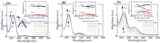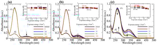 Changes in the polarized absorption spectra of the PNx films upon exposure to LP 365-nm light. Insets plot the absorbances at 262 and 335 nm. (a) PN10, (b) PN20, and (c) PN50.