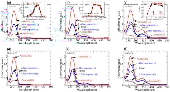 Changes in the polarized absorption spectra of the copolymer films before (black line) and after exposure (blue lines) to LP 365-nm light for (a–c) 5 J/cm2 and (d–f) 100 J/cm2, and subsequent annealing (red lines) at (a) 165 °C (PN10), (d) 160 °C (PN10), (b,e) 150 °C (PN20), (c,f) 140 °C (PN50). Inset plot changes in the D values as functions of exposure energy.