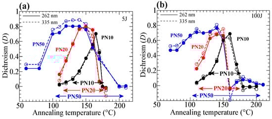 In case of the photoinduced molecular reorientation of LC polymeric films, thermal stimulation of the exposed films often amplifies the photoinduced optical anisotropy, where the amplification direction depends on the type of the material [1,15]. When the photoinduced reorientation is caused by the axis-selective photoisomerization, thermal amplification often occurs in the same direction of the photoinduced optical anisotropy, but in some cases, out-of-plane direction is sometimes amplified [26,49,50,51]. Significant in-plane thermal stimulation of the photoinduced optical anisotropy was observed in the PLCP with NBA1 and BA side groups [29]. Similarly, annealing the exposed copolymer film in its LC temperature range produces a significant cooperative molecular orientation in a direction perpendicular to the polarization of LP 365-nm light. Figure 4a–c show the change in the polarized absorption spectra of PN10, PN20, and PN50 films before and after exposure to LP 365-nm light for 5 J/cm2 and subsequent annealing at elevated temperatures. Photoinduced small anisotropy (D355 < 0.1) is significantly amplified after the annealing, where the cooperative molecular reorientation is generated for all copolymer films. D262 (D335) values of the reoriented films are 0.71 (0.71) for PN10, 0.80 (0.79) for PN20, and 0.80 (0.86) for PN50. The birefringence values of these films are 0.113 (PN10), 0.158 (PN20), and 0.181 (PN50) at 607 nm. The birefringent value increases as the amount of NBA2 groups increases due to the higher inherent birefringence of NBA2, where the birefringence of the reoriented PN100 film is 0.24 [27,28].