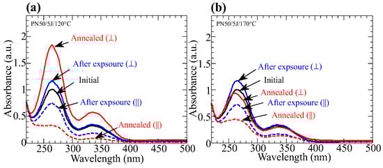 Changes in the polarized absorption spectra of the PN50 films before (black line) and after exposure (blue lines) to LP 365-nm light for 5 J/cm2 and subsequent annealing (red lines) at (a) 120 °C, and (b) 170 °C for 10 min.