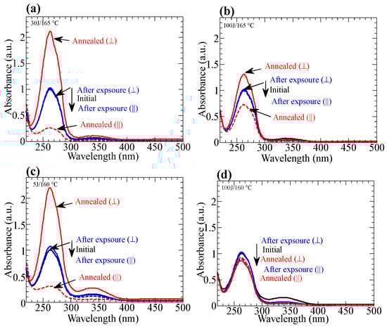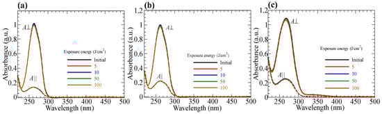 Additionally, absorbances for both directions at 335 nm decrease when the exposure energy exceeds 50 J/cm2, indicating a side photoreaction of the NBA2 [20]. Although the photoinduced optical anisotropy increases as the exposure energy increases, side photoreaction, such as photodegradation and photo-crosslinking of NBA moieties, inhibits the reorientation [46,47,48].