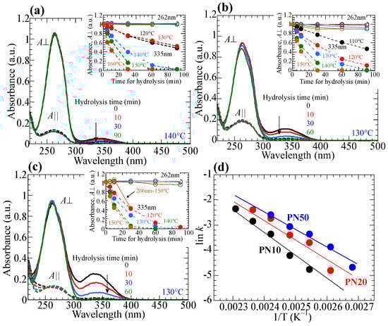 Changes in the polarized absorption spectra when oriented (a) PN10, (b) PN20, and (c) PN50 films are annealed at 140 °C (PN10) or 130 °C (PN20, PN50) under RH = 100% atmosphere. Insets plot the changes in the normalized A⏊ values at 262 and 335 nm annealed at various temperatures under RH = 100% atmosphere as functions of the hydrolysis time. (d) Arrhenius plots of the hydrolysis of PNx films.