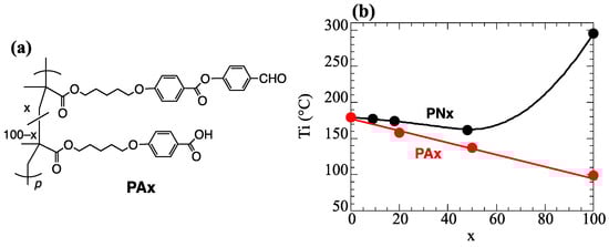 (a) Chemical structure of LC copolymers PAx. (b) Ti of copolymers as a function of copolymer composition.