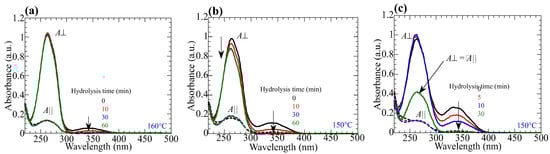 Changes in the polarized absorption spectra when hyrolyazed (a) PN10, (b) PN20, and (c) PN50 films are exposed to LP 365-nm light with E parallel to the orientation direction.