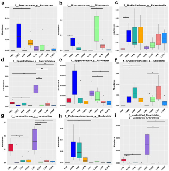 - Nagalingam, N.A.; Kao, J.Y.; Young, V.B. Microbial ecology of the murine gut associated with the development of dextran sodium sulfate-induced colitis. Inflamm. Bowel Dis. 2011, 17, 917–926. [Google Scholar] [CrossRef]