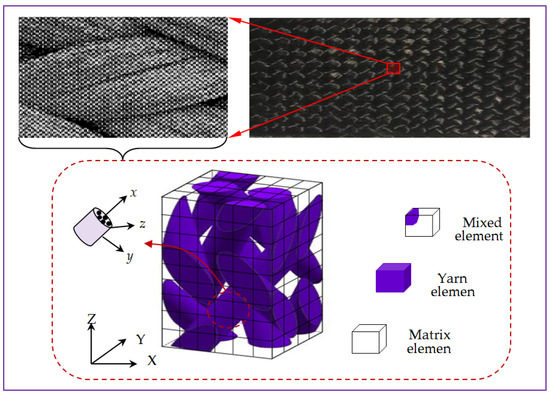 According to the fiber braiding process, the yarns are straightened and deformed during the tightening process. Following microscopic observation, the following assumptions are proposed: (1) the yarns are straightened; (2) the interface between the yarn and matrix is in good contact, and the interface effect is not considered. Based on the topological relation and the shape of the cross section, the RUC model of 3D braided carbon/resin composites is established as shown in Figure 3 [11]. The symbols X–Y–Z in capital form represent the coordinate system under the overall structure of 3D braided composites. Symbol Z represents the longitudinal direction and symbols X–Y represent the transverse direction. In order to overcome the difficulty of discretization for the yarn and matrix of 3D braided carbon/resin composites in numerical analysis, the multiphase finite element method [12] is employed. The micro-scale RUC is divided into three kinds of 20-node rectangular isoparametric elements including the yarn element containing only the yarns, the matrix element containing only the resin and the mixed element containing both the yarn and the resin, and 27 Gauss integral points are selected in each kind of element to calculate the total compliance/stiffness matrix of RUC in this work.