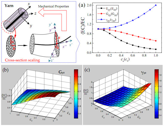 The elastic characteristics of a yarn related to the cross-section shape parameters in the case of only stochastic scaling. (a) Elastic constants Eyy (Ezz), Gxy (Gxz) and γxy (γxz); (b) shear modulus Gyz; (c) Poisson’s ratio γyz.