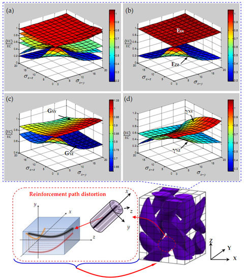 Considering the random waviness of the yarn path, the change of the mean elastic constant divided by the ideal elastic constant of a yarn is presented in Figure 4. Within the current parameter range, it can be seen that, except for the transverse elastic modulus or of yarn, other elastic constants are seriously affected by and . The longitudinal elastic modulus and in-plane shear modulus of yarn show the symmetrical characteristics of the changes of and , and the elastic constants , , , , and of the same type also show a certain symmetry, which further reflects the transverse isotropy for yarn. The waviness effect of yarn along each direction will obviously affect the elastic constant in the corresponding direction, but in general, the yarn waviness seems to have a greater impact on Poisson’s ratio and . In addition, the out-of-plane shear modulus , and Poisson’s ratio and increase with the increase in yarn waviness in the corresponding direction (x–y or x–z), but the in-plane shear modulus and Poisson’s ratio are less affected by yarn waviness.