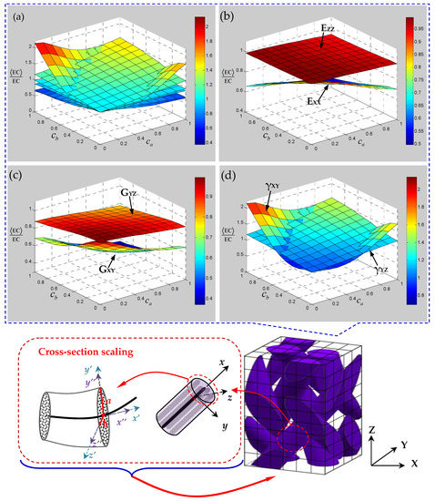 Considering the random scaling effect of the long and short semi-axis of the elliptical cross-section of yarn, the change in the mean elastic constant divided by the ideal elastic constant of yarn is presented in Figure 5. It should be explained that the longitudinal elastic constant of yarn is independent of the shape parameters and , since the random scaling effect of the cross-section only acts on the y-axis and z-axis. It can be seen from Figure 5a that the transverse elastic modulus () and the out-of-plane Poisson’s ratio () are more affected by the yarn cross-section scaling than the out-of-plane shear modulus (). The transverse elastic modulus (), out-of-plane shear modulus () and out-of-plane Poisson’s ratio () of yarn are only determined by the change of scaling parameters (,) in the corresponding direction. According to Figure 5c,d, the in-plane shear modulus and in-plane Poisson’s ratio are jointly determined by the change of scaling parameters (, ) in the direction of the long and short semi-axis of the elliptical cross-section.