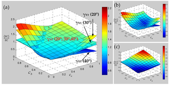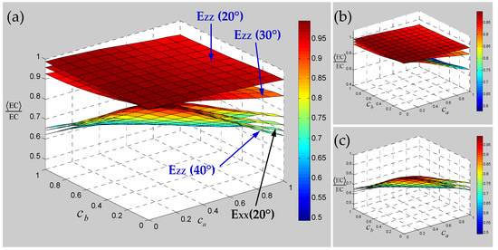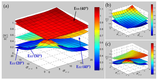 Sensitivity of elastic modulus for 3D braided carbon/resin composites with different braiding angles (20°, 30°, 40°) to the distortion characteristic parameters and of a yarn: (a) general drawing, (b) elastic modulus EXX, (c) elastic modulus EZZ.