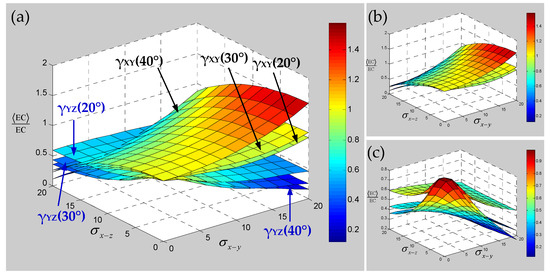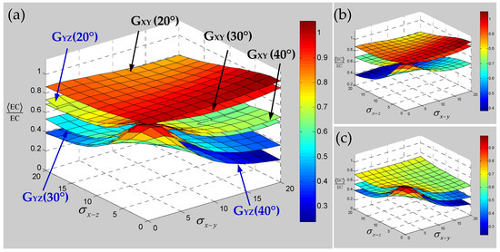 Numerical results of the sensitivity for the elastic constants of 3D braided carbon/resin composites with different braiding angles to the random scaling effect of a yarn cross-section are presented in Figure 13, Figure 14 and Figure 15. As shown in Figure 13, the change of braiding angle causes the longitudinal elastic modulus EZZ to be more sensitive to the yarn cross-section scaling than the transverse elastic modulus EXX, and the sensitivity of the longitudinal elastic modulus EZZ to the yarn cross-sectional scaling increases gradually with the increase in braiding angle. However, the sensitivity of the transverse elastic modulus EXX to the scaling effect of the yarn cross-section is not obvious with the increase in braiding angle, and there is a certain intersection area. As shown in Figure 14, the influence of braiding angle change and yarn cross-section scaling on the in-plane and out-of-plane shear modulus of the material is determined. The increase in braiding angle leads to the decrease in the sensitivity of in-plane shear modulus GXY and out-of-plane shear modulus GXZ to the random scaling effect for yarn cross-section. In contrast, the in-plane shear modulus GXY is more sensitive to the random scaling effect of a yarn cross-section under the influence of braiding angle. It also shows that the effect of random scaling for yarn cross-section on the shear modulus will gradually decrease with the increase in braiding angle. As shown in Figure 15, the effect of braiding angle on the elastic constants γXY and γYZ under the scaling effect of yarn cross-section is obviously different. The sensitivity of the out-of-plane Poisson’s ratio γYZ to the scaling effect of the yarn cross-section is very small, and almost negligible due to the change of the braiding angle. The sensitivity of the in-plane Poisson’s ratio γXY to the scaling effect of the yarn cross-section is gradually increased by the change of the braiding angle, and the effect is small when the characteristic parameter (, ) is less than 0.4. In general, with the increase in braiding angle, the sensitivity of material elastic constants to yarn cross-section scaling effect is slightly weaker than that of yarn path waviness shown in Figure 10, Figure 11 and Figure 12.